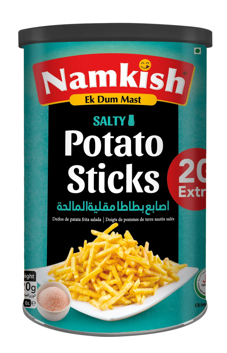 It’s a cylindrical can containing thin, crispy, salted potato sticks. The design features a teal background, a red brand label at the top, and an image of golden potato sticks served on a plate with a small bowl of salt. The text appears in multiple languages, including English and Arabic, and there’s a “20% Extra” note on the front.